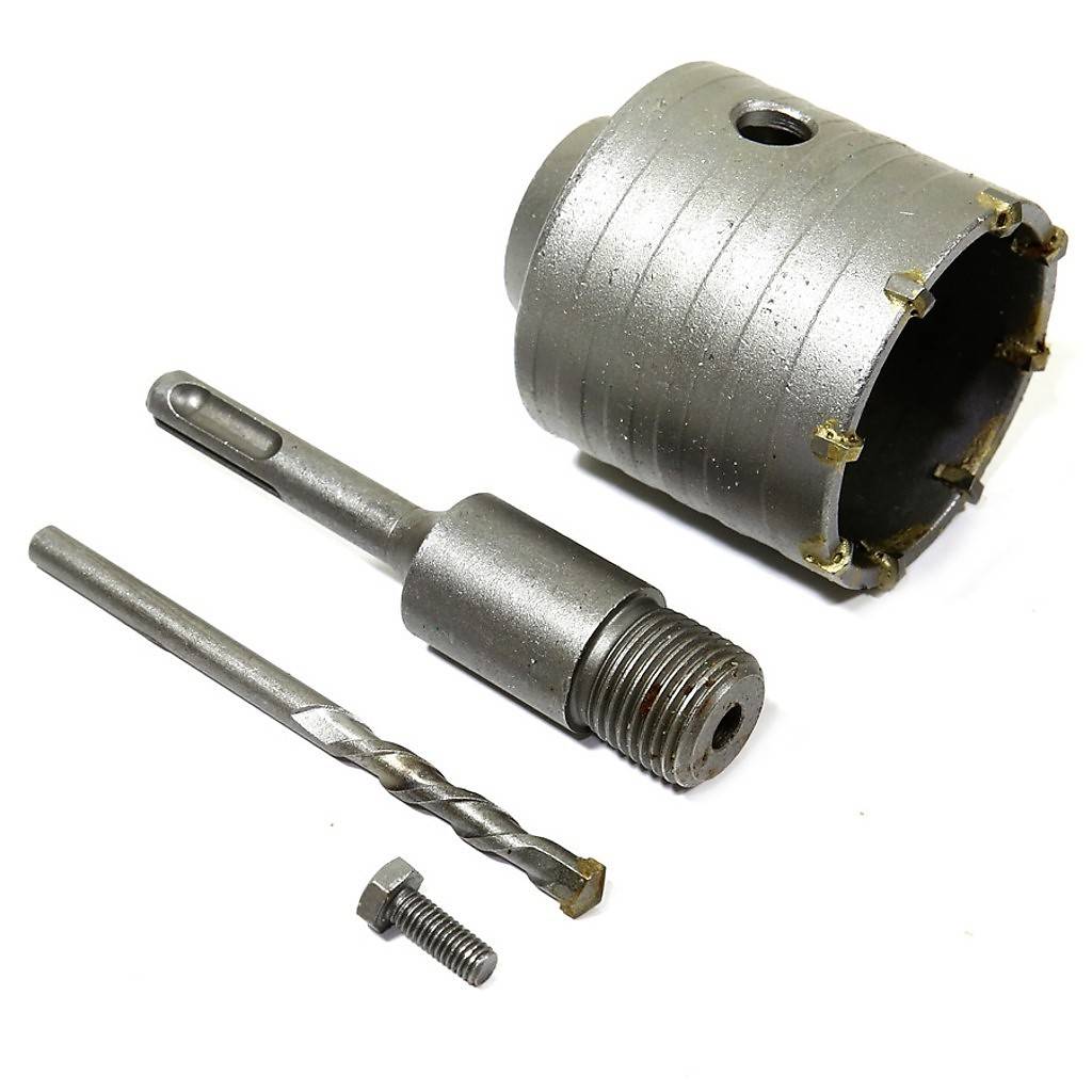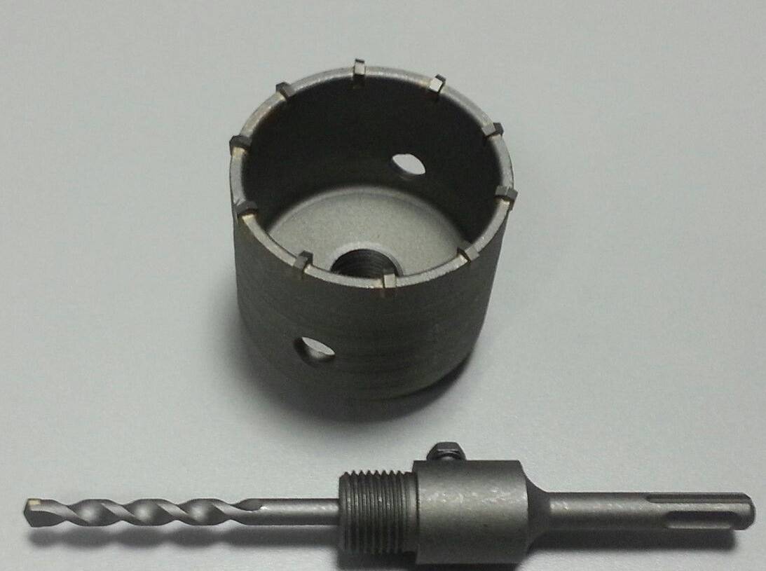 - Твердосплавные. Считаются наиболее бюджетными вариантами коронок под перфоратор. Поэтому рекомендуют использовать только при обработке бетона. Если коронка столкнётся с металлом, тогда зубцы наверняка сломаются, либо деформируются. Выпускаются в диаметре от 20 до 100 мм. Причём диаметр 70 мм как раз предназначен для сверления отверстий под розетки и выключатели.
