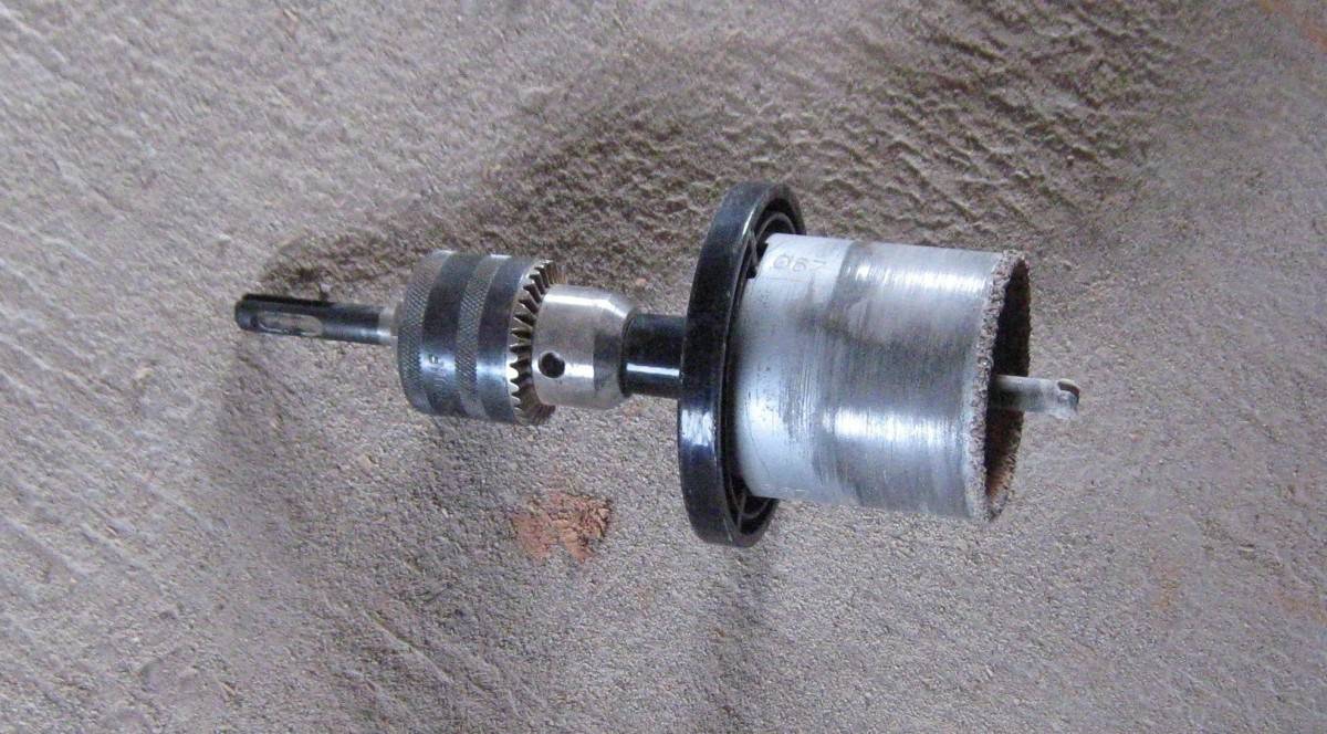 Ее внешний вид можно описать такими словами: это кусок стальной трубы среднего диаметра, по бокам есть отверстия, через которые пыль отводится во время работы. По центру находится сверло, которое дает направление режущей кромке и фиксирует приспособление на поверхности. если можно так сказать. Эта коронка является насадкой для перфоратора или дрели.