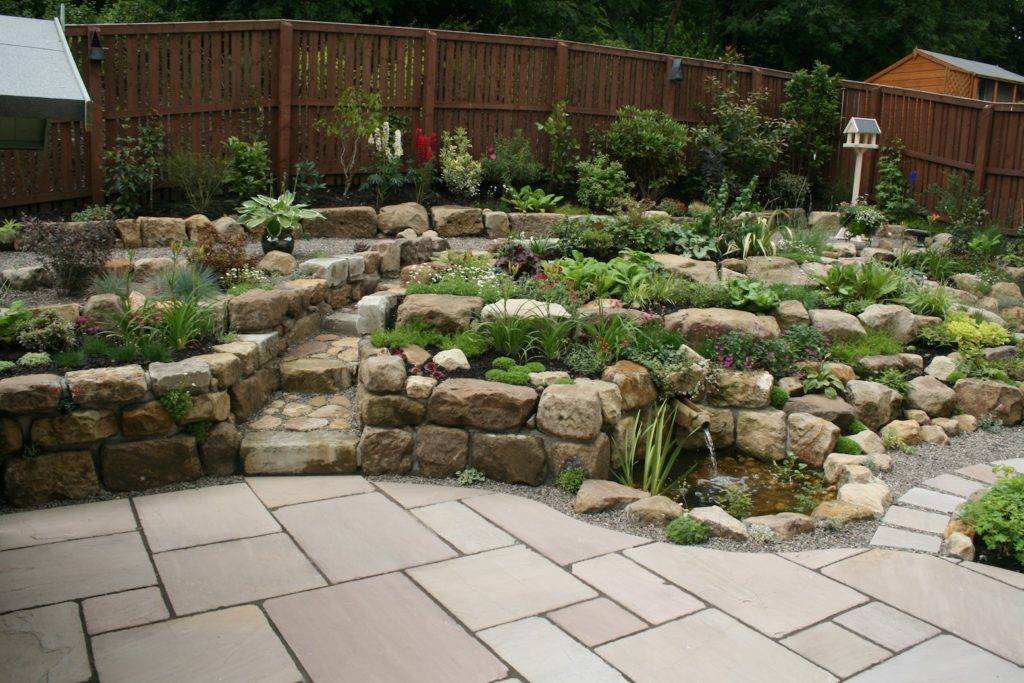 Следующий шаг наиболее ответственный – установка крупных камней и при необходимости слоистых плит по части периметра для создания террас. В зависимости от высоты создаваемой террасы, плиты могут скрепляться цементным раствором или пересыпаться землей с добавлением глины.