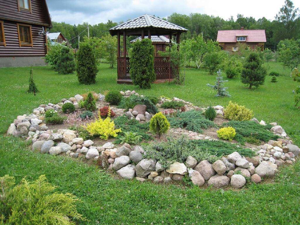 При выборе площадки учитывайте особенности рельефа. Если на дачном участке есть возвышение, проще устроить альпинарий на склоне, чем создавать холмик с нуля; если впадина – можно ее оформить в виде арыка или ущелья.