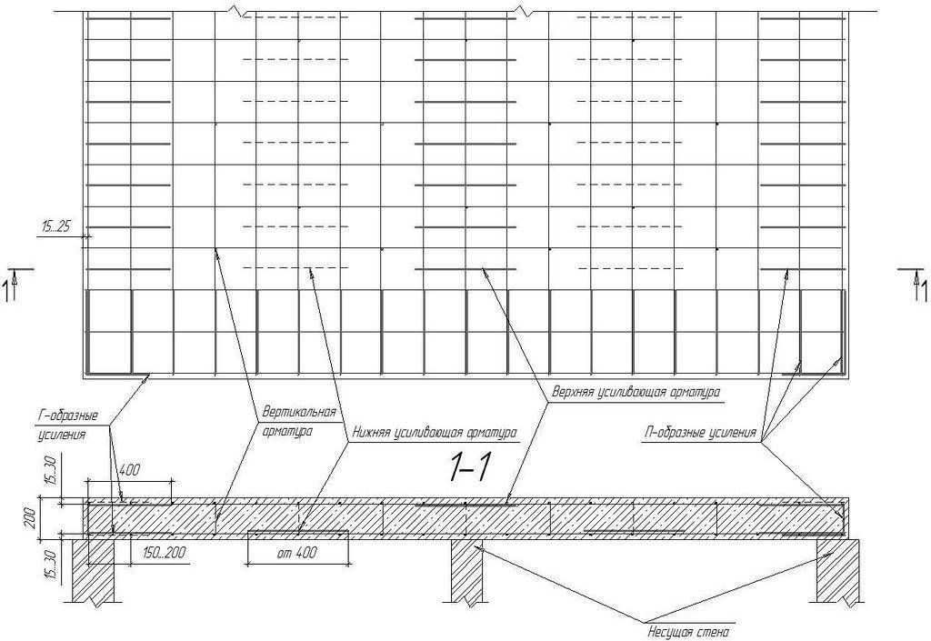 Толщина перекрытия чаще всего принимается равной 200 мм. Армирующий каркас в этом случае включает в себя две сетки, расположенные друг над другом. Такие сетки нужно связать из стержней диаметром 10 мм. В середине пролета устанавливают дополнительные пруты усиливающей арматуры в нижней части. Длина такого элемента назначается 400 мм или более. Шаг дополнительных прутов принимают таким же, как шаг основных.
