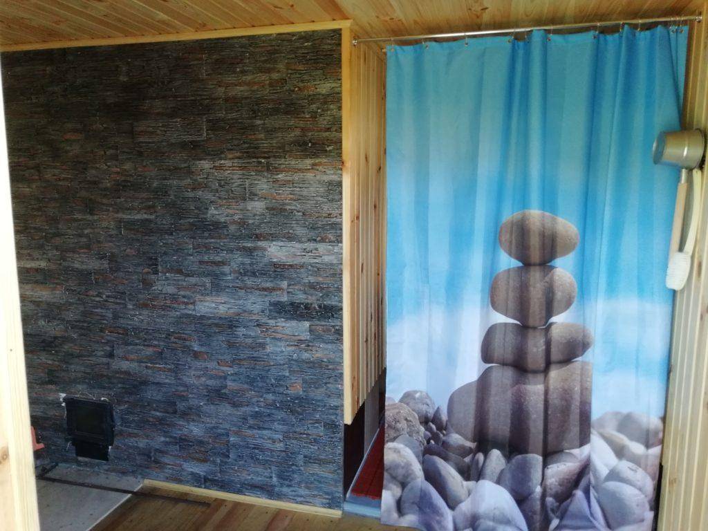 Смежную с парилкой стену выложил плиткой «под камень» и покрыл акриловым лаком. Получилось симпатично.