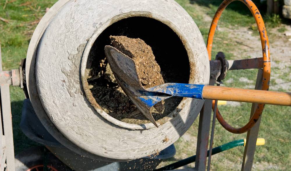 - Залейте в барабан бетономешалки небольшое количество воды, после чего добавьте туда цемента и хорошо перемешайте до получения серого молочка. С этого момента барабан должен вращаться непрерывно;