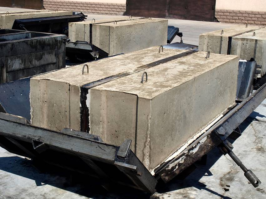 Разные виды блоков могут быть изготовлены из тяжелого, легкого состава или керамзитобетона. В первом случае применяется бетон марок М250, М300 и М400, который обеспечивает плотность изделий до 2400 кг/м³. Один элемент имеет вес от 300 кг, что зависит от размера изделия. Блоки из тяжелого бетона характеризуются высокими показателями морозоустойчивости, теплопроводности.