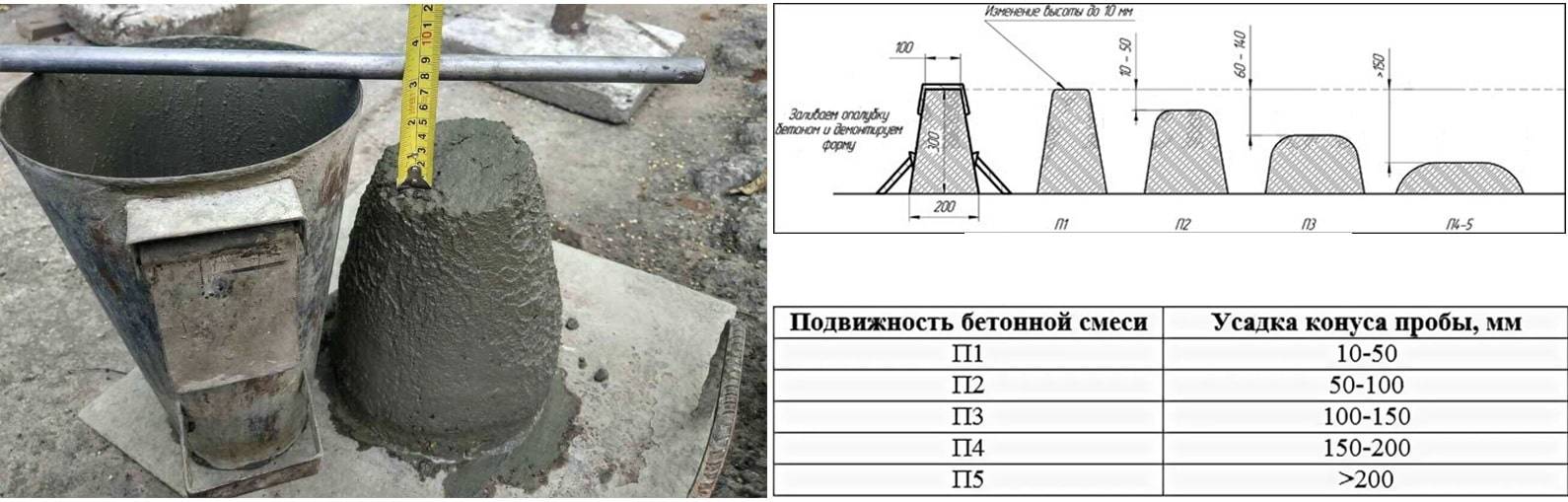 Для проверки чаще всего применяют усеченный конус, который имеет конкретные размеры, нижний край 20 см, а верхний 10 см.