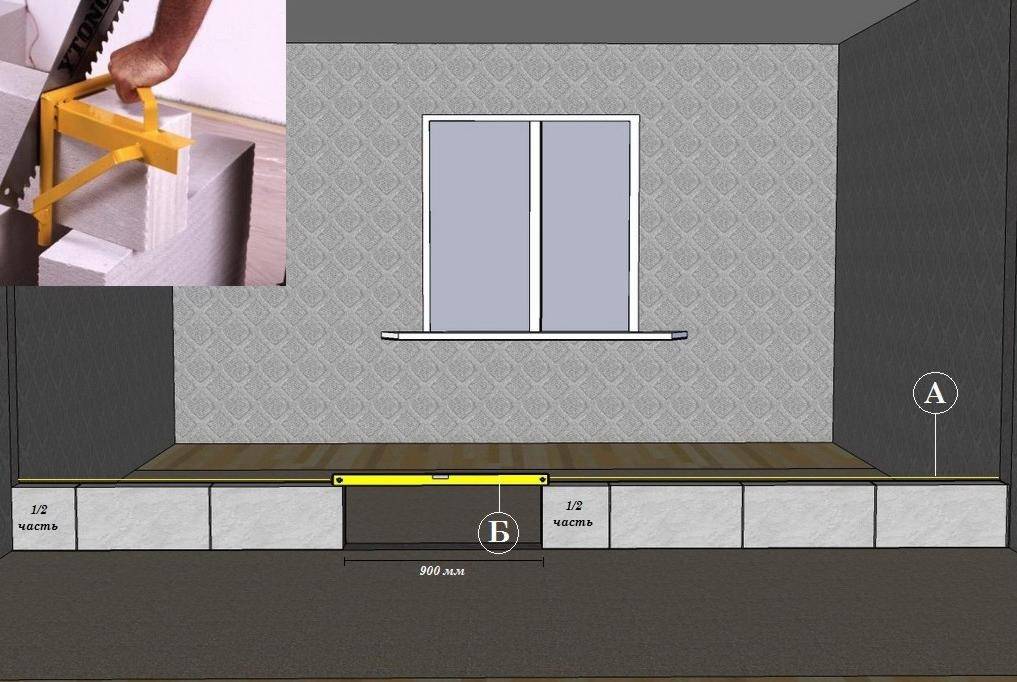 После установки первого пеноблока, продолжаем установку остальных пеноблоков первого ряда перегородки. Для соблюдения горизонтальности кладки можно использовать натянутый шпагат (А), а так же обязательный контроль строительным уровнем (Б). Для того чтобы обеспечить разбежку вертикальных швов в первом ряде кладки необходимо использовать половинные блоки.