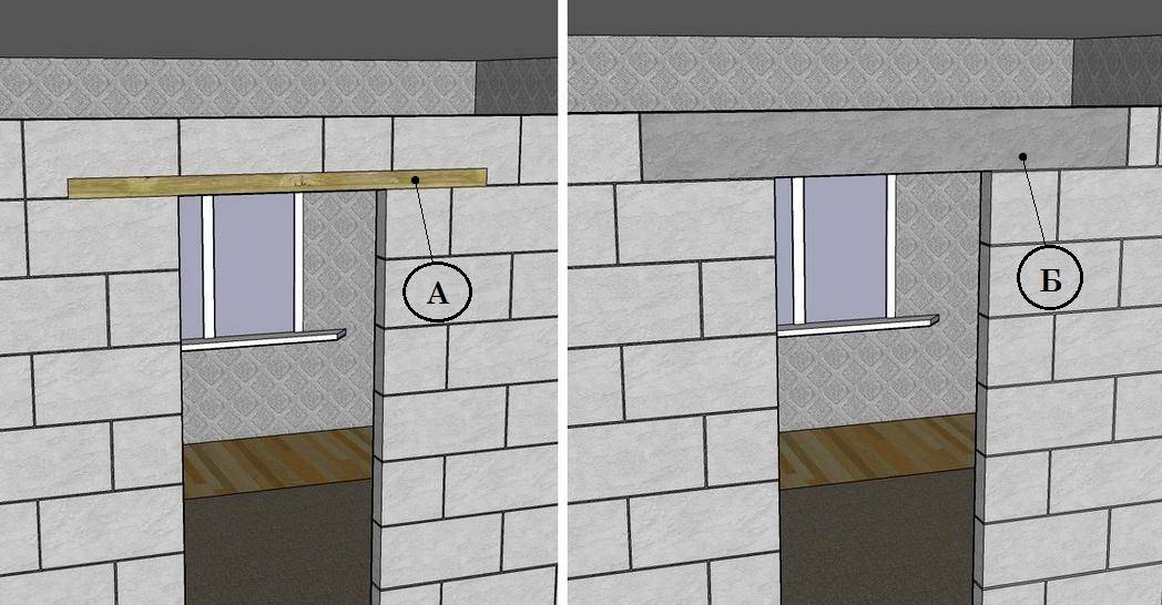 В нашем случае качестве перемычки можно использовать деревянный брусок (А) сечением 100х80 мм или установить готовую перемычку из автоклавного ячеистого бетона (Б) ТУ 5828-001-39136230-95. Можно использовать два вида таких перемычек – ПБ-2 или ПБ – 3, технические характеристики которых указаны в таблице 1.