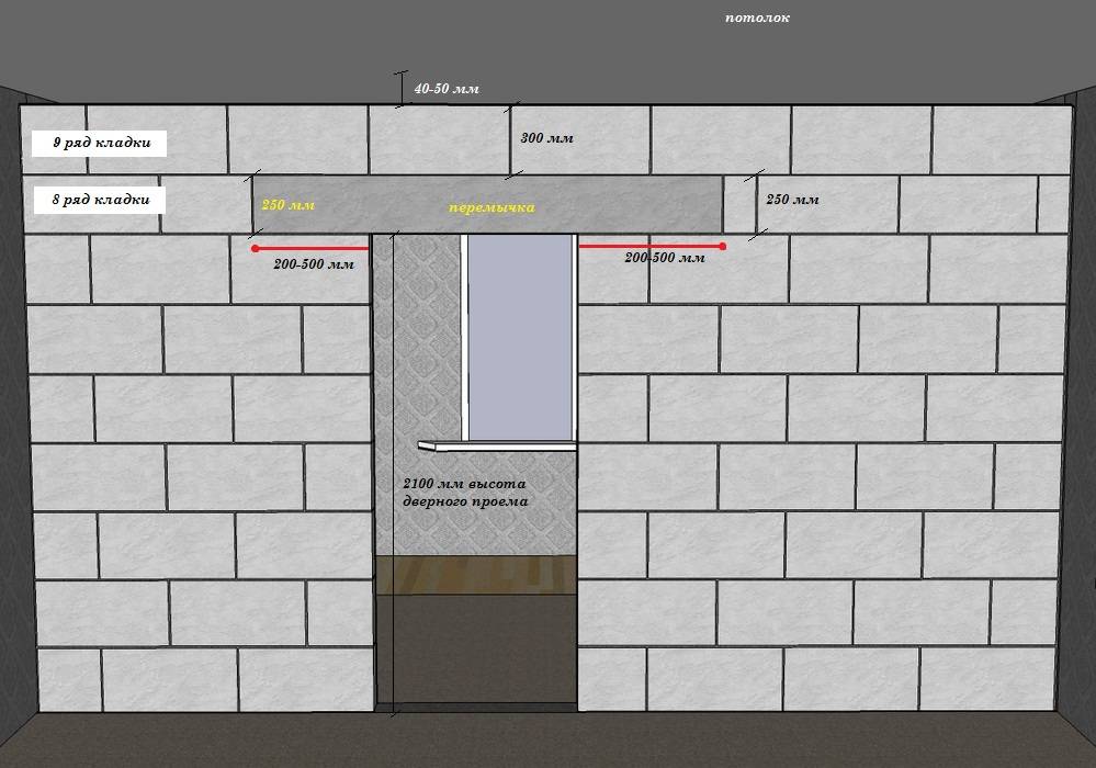 Напуск перемычки на перегородку по краям дверного проема рекомендуется делать в пределах 500 мм с каждой стороны. В нашем случае нагрузка на перемычку будет ниже допустимой, поэтому напуск можно сделать меньше чем 500 мм, но не менее чем 200 мм с каждой стороны.
