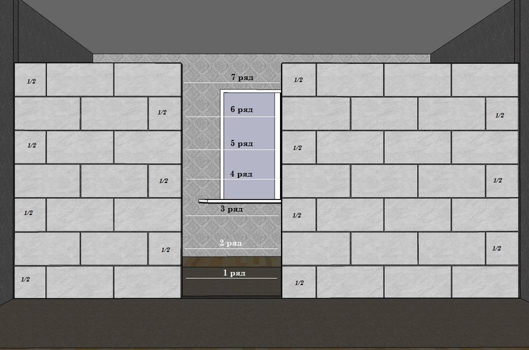 Для получения половинных блоков их необходимо распилить с помощью ножовки на две равные части. У стен дома, к которым примыкает перегородка, можно устанавливать как целые блоки, так и половины блоков. Когда первый ряд готов, приступаем к кладке следующих рядов. Рекомендуемое расположение вертикальных швов и перевязка блоков: