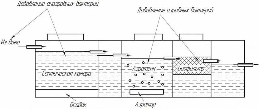 За счет многодневного отстаивания, отделения нерастворимого осадка от воды и деятельности микроорганизмов, происходит естественное очищение сточных вод. Все камеры септической системы используются только для отстаивания.
