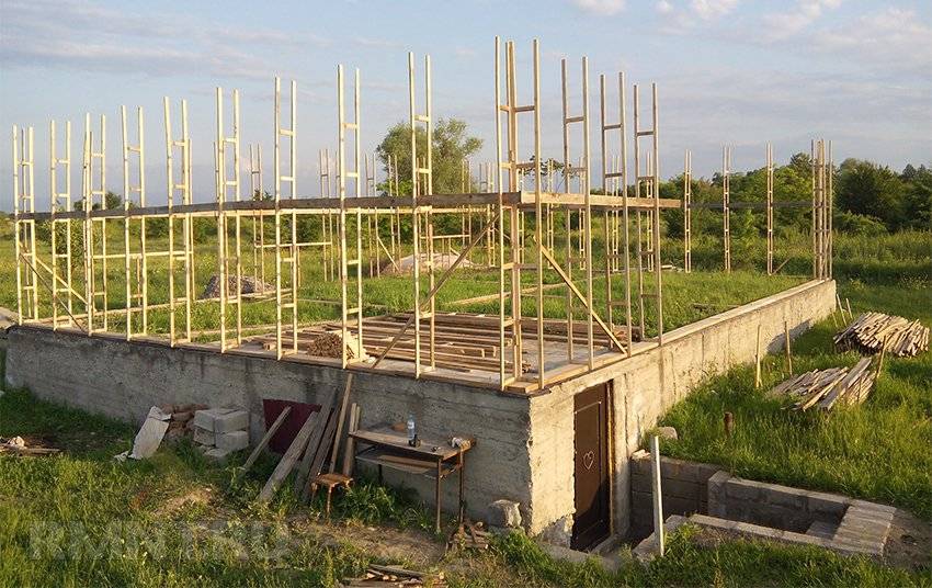 В случае возведения монолитных стен в качестве «арматуры» используют обычные дощатые рамки. Их устанавливают вертикально с шагом 1200–1500 мм. Это придаёт конструктивную жёсткость всей стене и создаёт обязательный деформационный шов, необходимый для равномерного распределения нагрузок усадки при перемене влажности. Доску предварительно следует антисептировать.