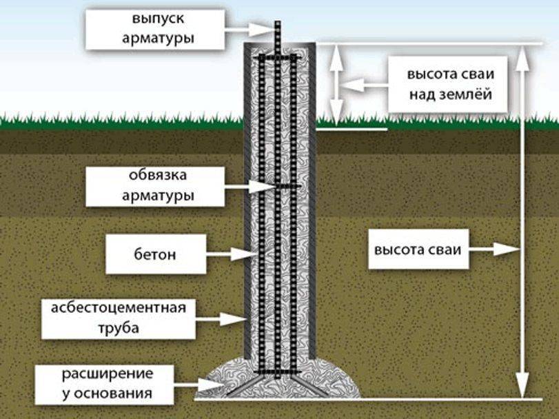 В зависимости от размеров строения и его веса трубы, как опалубка для свай, могут быть разного диаметра. Обычно применяют изделия из асбеста или пластика (канализационные трубы). Общие параметры трубчатой сваи можно увидеть на приведенной схеме.