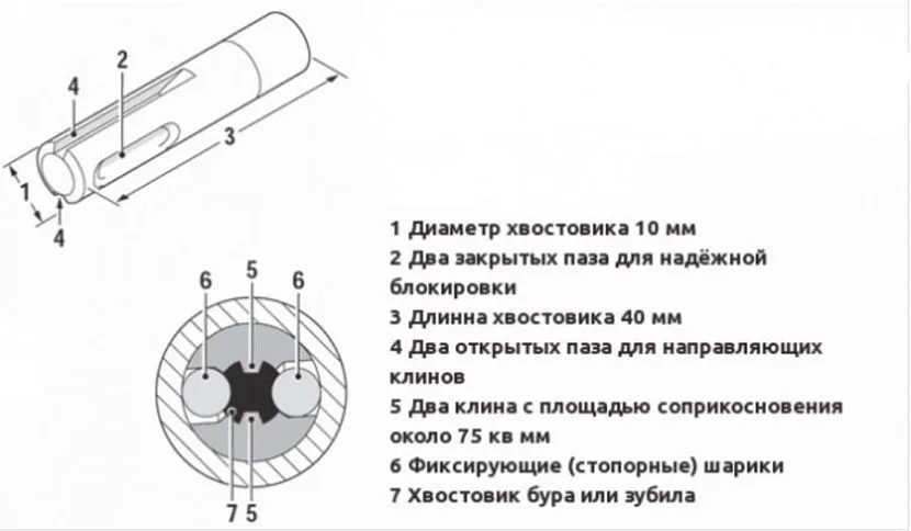 Эта система применяется для фиксации инструмента, диаметр хвостовика которого составляет 10 мм (на таком хвостовике есть две канавки).