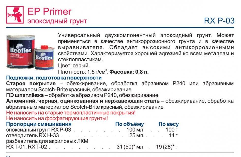 В составе эпоксидных составов присутствуют специальные смолы. Могут содержаться специальные активные добавки, которые защитят поверхность металла от коррозии. Составы отличаются быстрыми темпами высыхания.
