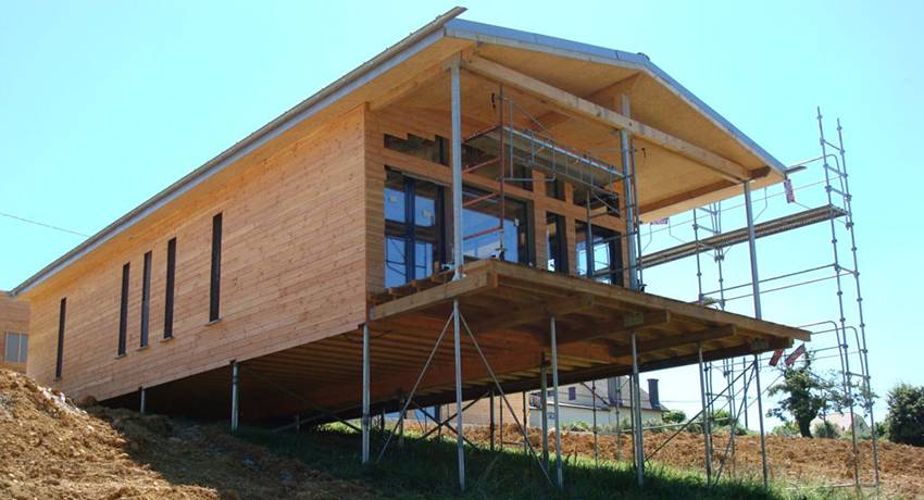- почти не требует подготовки строительной площадки и выполнения трудоемких земляных работ (рытья котлованов, траншей) – всего лишь несколько ям для свай.