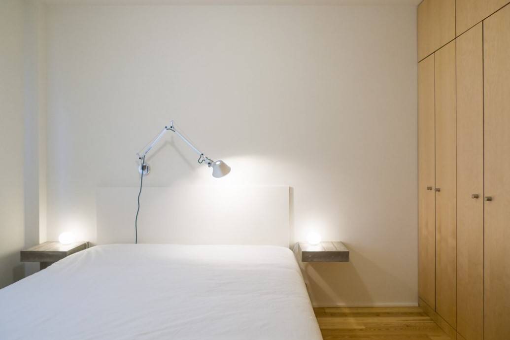 На фото минималистичная спальня. Бетонные стены имеют шероховатую фактуру.