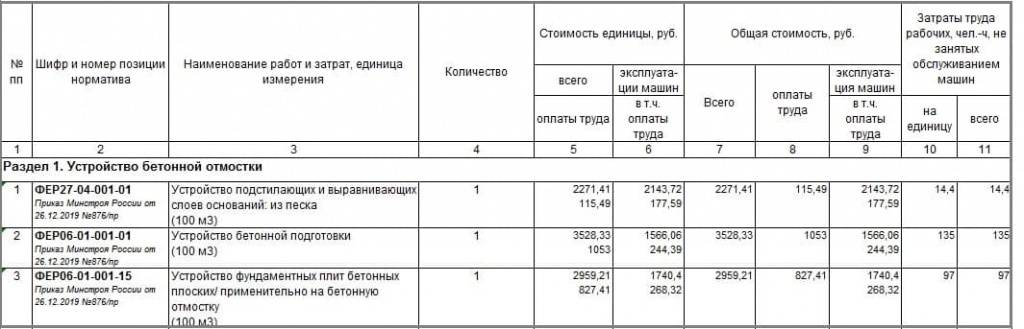 Как отмечалось выше, расценка в смете на устройство отмостки из бетона представляет собой довольно обширный комплекс работ, поэтому, как правило, отображается в составе сметной документации при помощи нескольких норм из различных сборников сметных баз ФЕР. Однако следует отметить, что при строительстве нового объекта все расценки в смете на отмостку из бетона применяются из строительной части сборников, в то время как сметы на ремонт отмостки рекомендуется составлять при помощи ремонтно-строительных сборников.