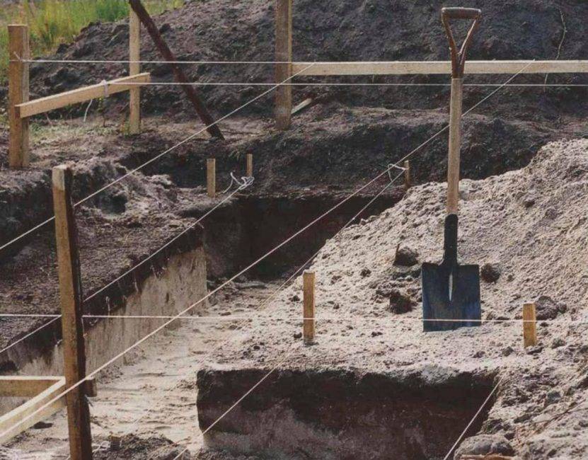 Котлован. Приступая к работам необходимо подготовить котлован будущего фундамента. Копать траншеи нужно на 5-10 см шире, чтобы после установки и раскрепления плоскостей из досок можно было засыпать пространство землёй, тем самым укрепив конструкцию.