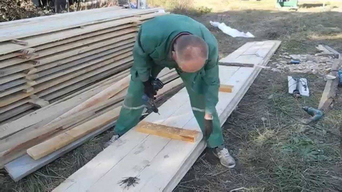 Изготовление щитов. Исходя из высоты конструкции, сбиваются изделия из досок и брусьев, которые располагают по длине через 40-50 см. Длина плоскостей зависит от размера доски (это может быть 3 или 4 метра).