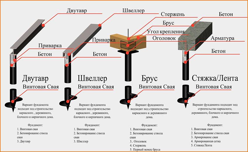 Существуют различные варианты конструкции свайного фундамента, обладающие собственной спецификой.