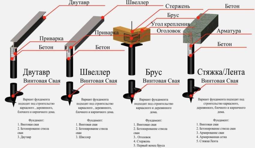 Существуют различные варианты конструкции свайного фундамента, обладающие собственной спецификой.