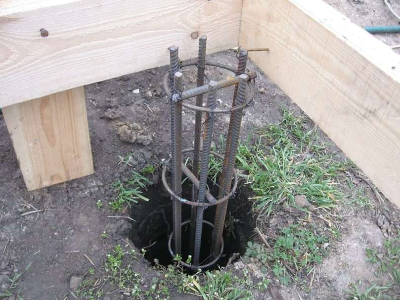 Свайный фундамент представляет собой заглубленные в землю опоры, заливаемые бетоном. В вертикальном направлении сваи армируются ребристыми прутьями, имеющими в диаметре десять миллиметров.