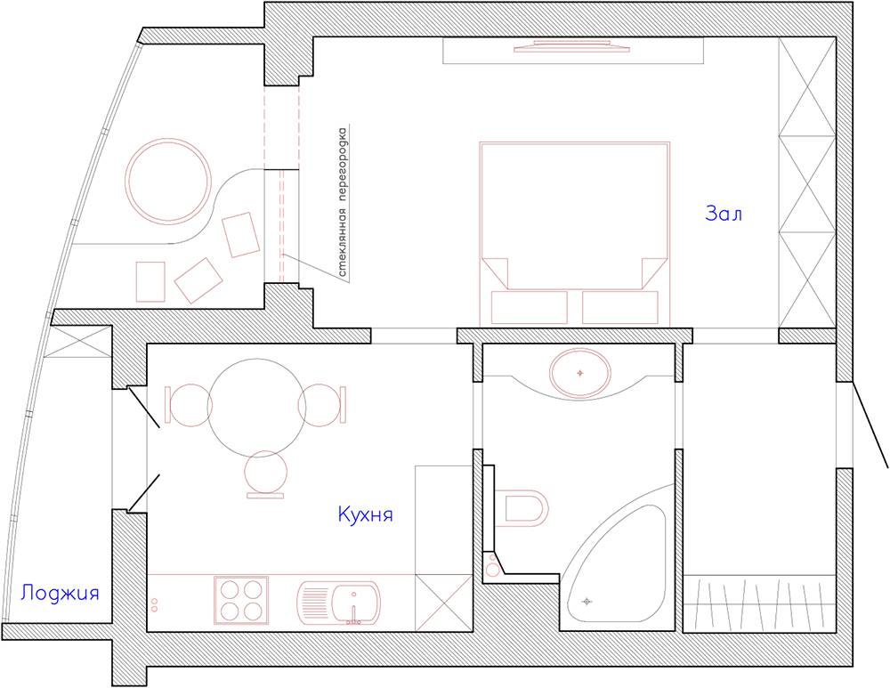 Определяющими факторами планировки квартиры-студии являются количество и расположение окон, геометрическая форма помещения и размещение коммуникаций