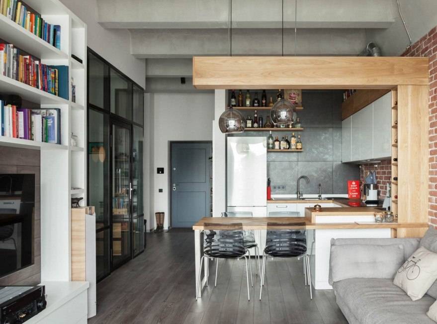 Лучше всего воспользоваться естественной перегородкой, которая остается после сноса стенки. Однако можно создать ее искусственно. Самый простой способ – барная стойка или островок. Это одновременно и граница, и удобная часть мебельного гарнитура. В квартире должно быть минимум вещей и мебели