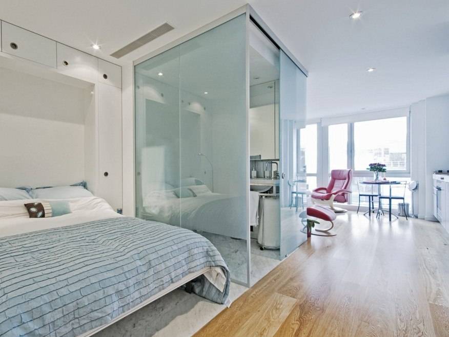 - Ограждение стеной. Не стоит мешать гостиную и спальню, так как полученная комната потеряет качество первого и второго. Ремонт квартиры студии не требует возведения фундаментальной перегородки. Достаточно небольшого простенка или даже стеклянной изгороди. Ее будет хватать для полноценного отдыха и даже отдельного сна.