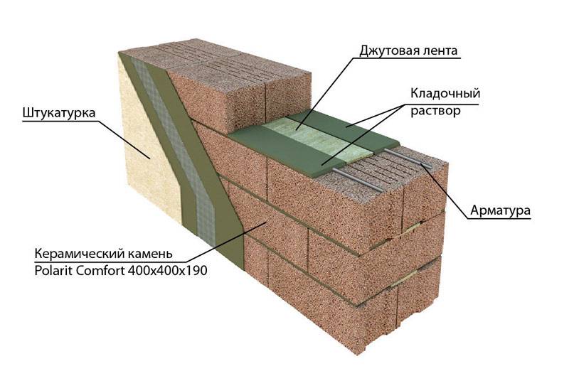 При этом важно помнить, что цементно-песчаный раствор обладает крайне высокой теплопроводностью и способствует появлению мостиков холода. Чтобы построить теплый дом стоит запастись джутовой лентой. Раствор кладут только по краям обреза стены, а в середину заводят утеплитель, который предотвратит потери тепла через слабые места конструкции