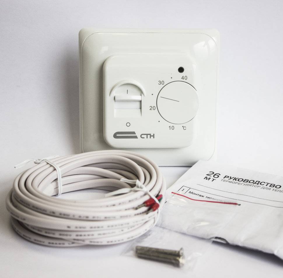 Терморегулятор в комплекте с выносным температурным датчиком, монтажные коробки, провода приобретают дополнительно. При выборе первого элемента учитывают максимум энергопотребления. Сечение проводов подбирают, ориентируясь на мощность системы и материал изготовления.