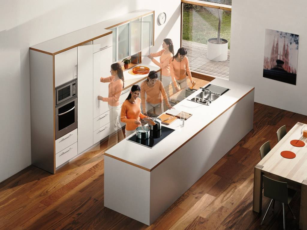 - разную технику размещают согласно требованиям безопасности, например, не ставят рядом мойку и плиту, мойку и холодильник (исключение, если он встроенный);