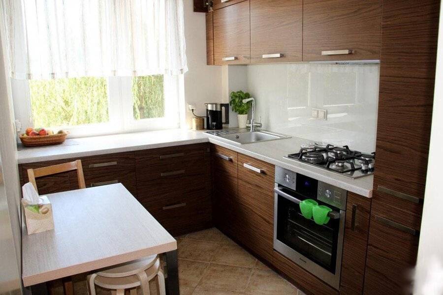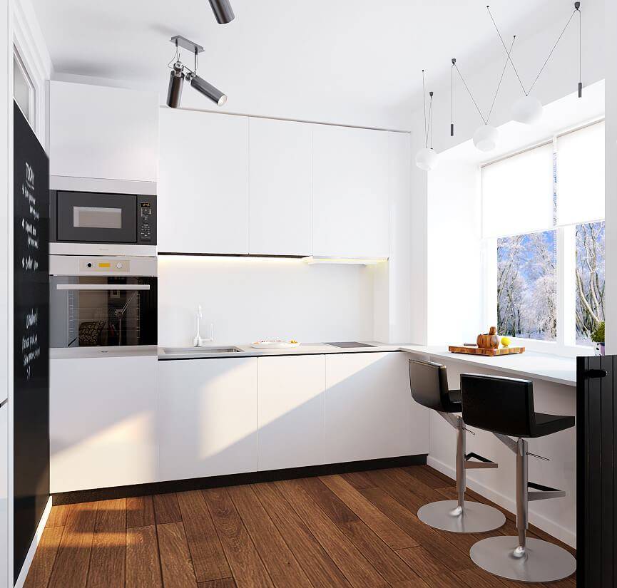 В планировке существенно, квадратное помещение или длинное. Квадратная кухня – обычная с точки планировки. В удлиненной в сторону окна, можно выделить миниатюрную обеденную зону у окна.