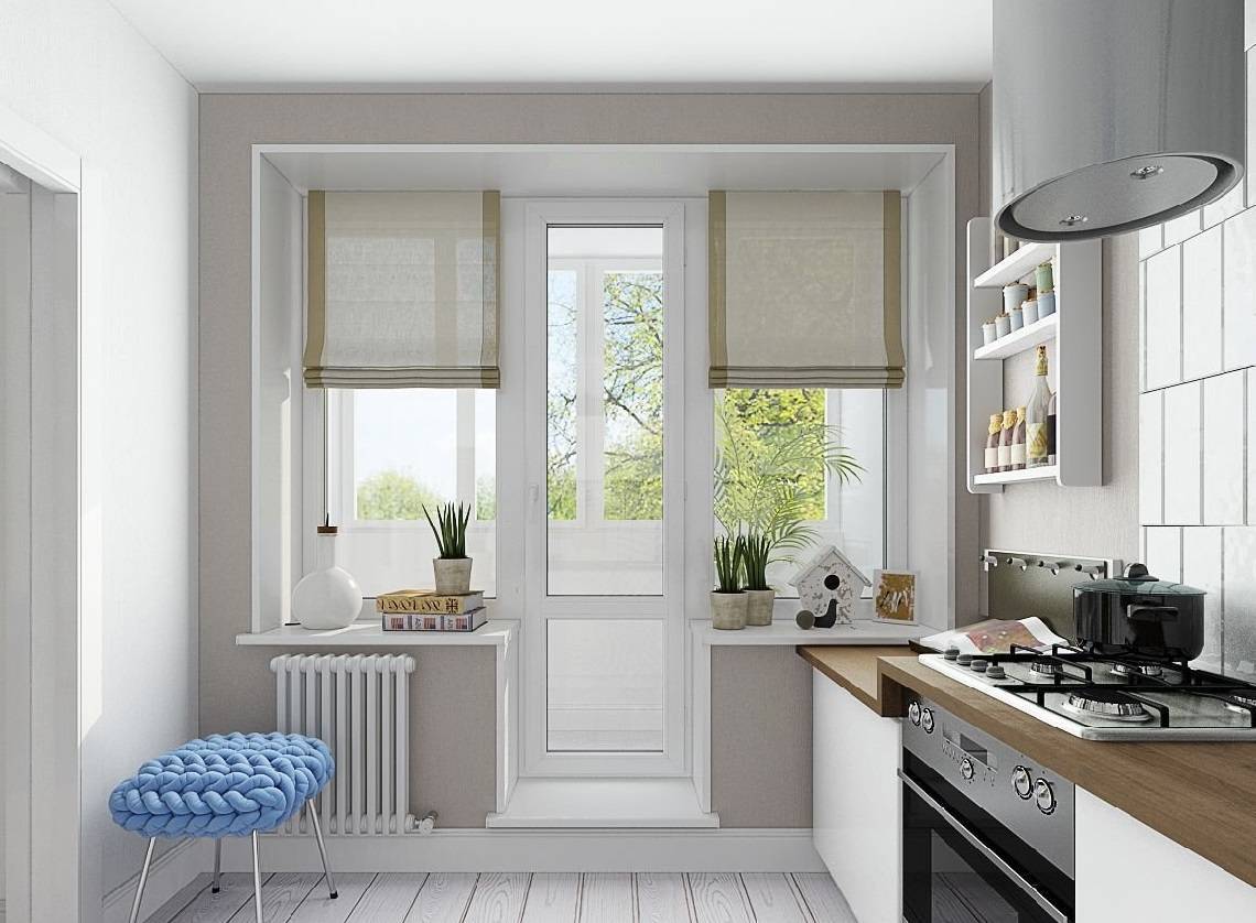 Устройство проема путем удаления полностью подоконного блока дает возможность установки широких дверей в образовавшийся большой просвет. Такое решение направлено на совмещение внутреннего пространства кухни с лоджией. Оно создает иллюзию расширения кухни, но при этом сохраняет индивидуальность каждого помещения.