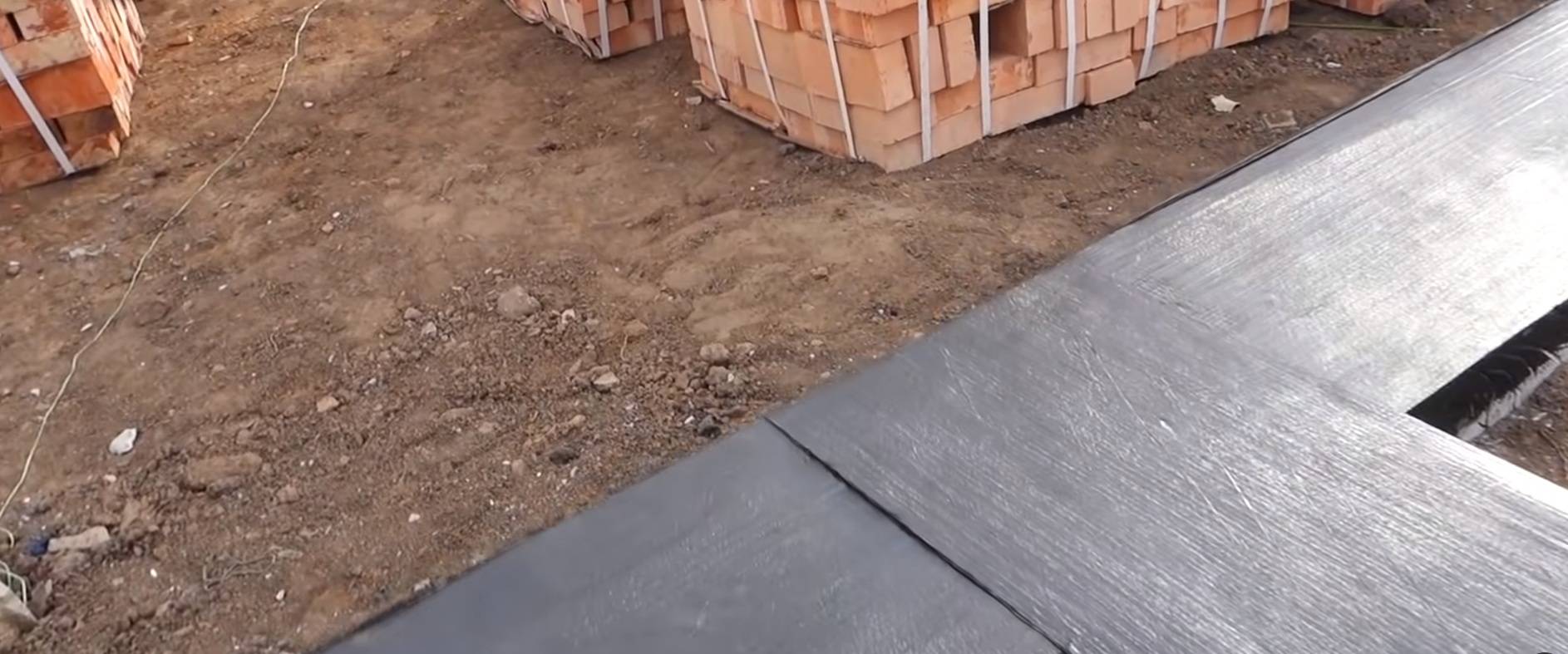 Бикрост ТПП или рубериод – материалы для горизонтальной гидроизоляции фундамента дома. Сначала наносится праймер Технониколь №01, потом кладется рубероид или Бикрост ТПП, края обрезаются. Гидроизоляция защищает от влаги, образования трещин при возможной усадке дома. На гидроизоляционный слой кладется несколько рядов кирпича.