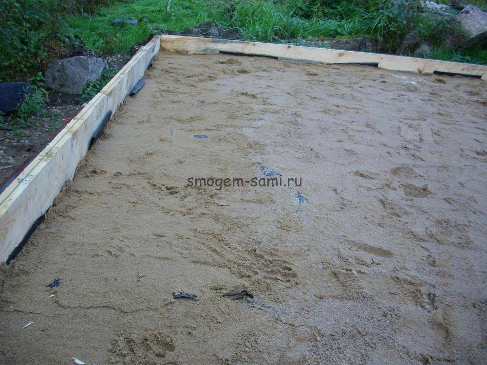 Чтобы уплотнить песчаную подушку под основанием, нужно пролить ее небольшим количеством воды.