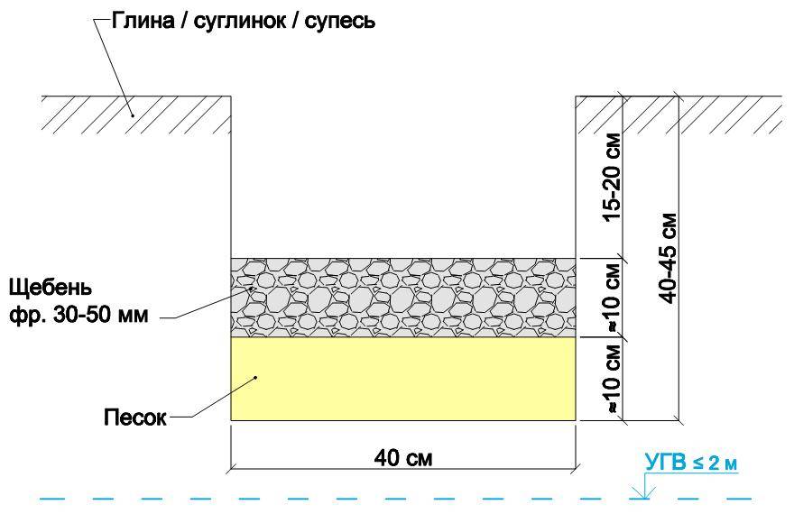 Подсыпка — в ямы засыпается 10-ти сантиметровый слой песка, который проливается водой и утрамбовывается, поверх песка размещается слой мелкого щебня аналогичной толщины;
