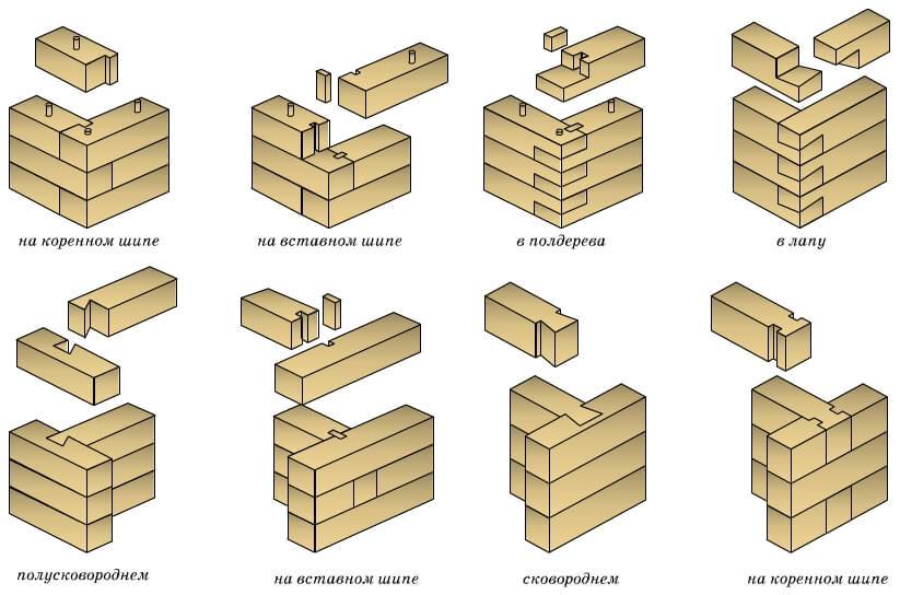 Если же брус обычный, то придется изучить подходящие способы соединения. Например, считается, что подходит для небольшого строения соединения «в полдерева», «в лапу» и другие. Наиболее популярные соединения бруса есть на картинке.