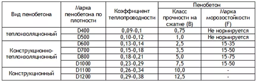 Таблица зависимости плотности газобетона и коэффициента теплопроводности (чем он выше, тем быстрее материал отдаёт тепло окружающей среде и делает помещение холодным)