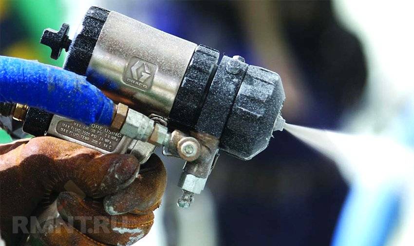 Далее можно приступать к напылению материала. Наиболее часто используемым способом нанесения полимера, который применяется в 95% случаев, является напыление с помощью специального оборудования. Операция проводится в несколько этапов: