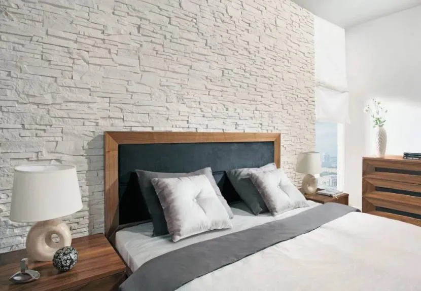- В спальне. Гипсом облицовывают стену у изголовья кровати, либо противоположную кровати. Отделку делают светлой, часто белой; получается уместно и стильно.