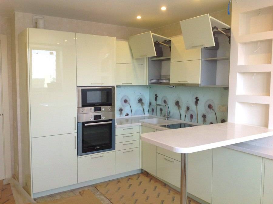 Стильный П-образный кухонный гарнитур с полуостровом – подходящее решение для кухни-гостиной площадью 17-25 кв. м. С ним зона приготовления пищи будет выглядеть обособленной, а интерьер сохранит целостность.
