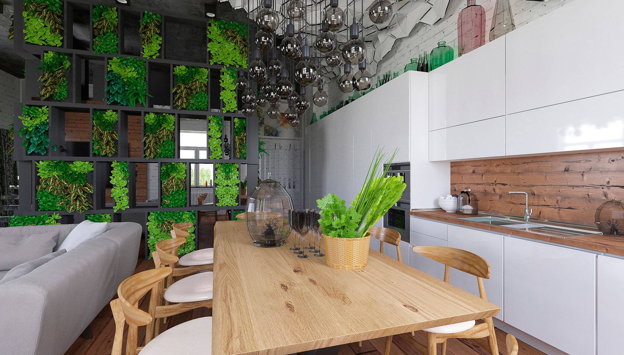 5. Дизайн кухни-гостиной с декоративной перегородкой