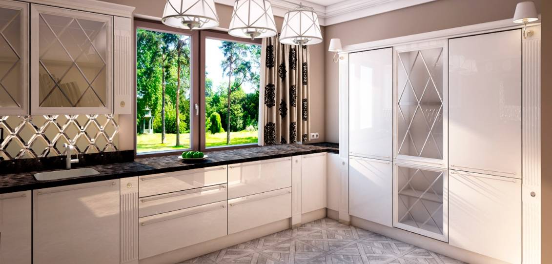 Это гарнитуры и обеденные зоны, выполненные с применением изящных декоративных элементов. В настоящее время многие предпочитают устанавливать на кухонном пространстве легкие гарнитуры в стиле неоклассика. Кроме стола со стульями, кухонной встроенной мебели, здесь может быть установлен пинал, а также шкаф, в котором прячется холодильник и другая техника.