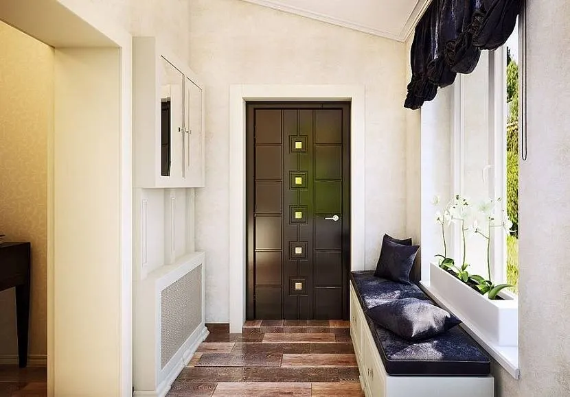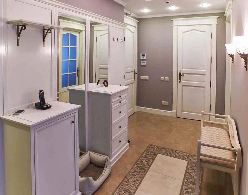 Обычно в таких квартирах коридорного типа сложно обозначить границу между коридором и собственно прихожей. Самое простое – постелить у порога ковер или короткую дорожку. Если в качестве напольного покрытия выбран камень, керамогранит или керамика, то можно выложить по нему «ковер» мозаикой или декоративными элементами, это модный, неизбитый прием.