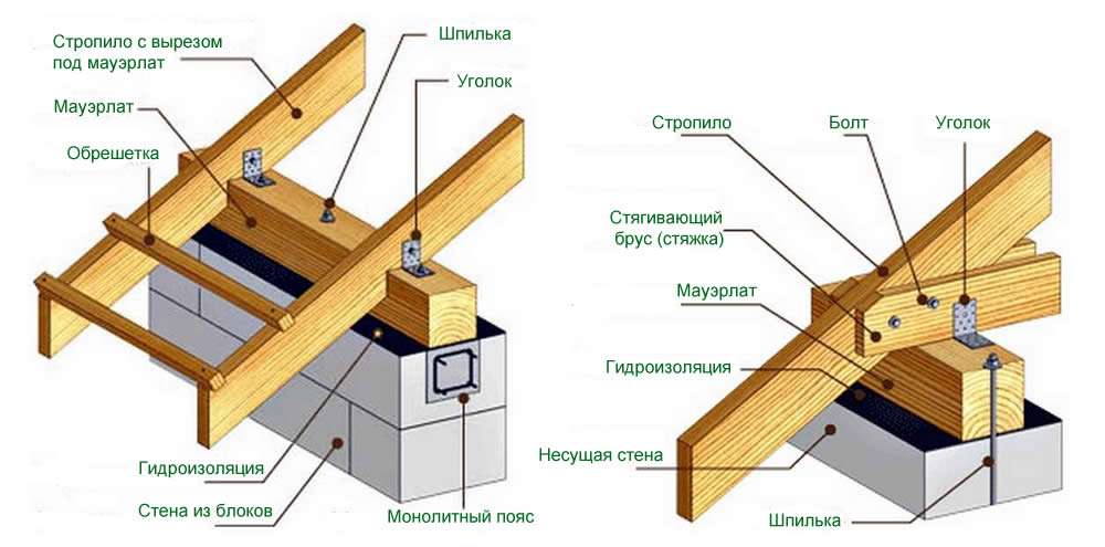 Иногда проблематичным оказывается процесс крепления нижних торцов стропильных столбов. В этом случае используют еще один элемент крыши, называемый мауэрлатом.