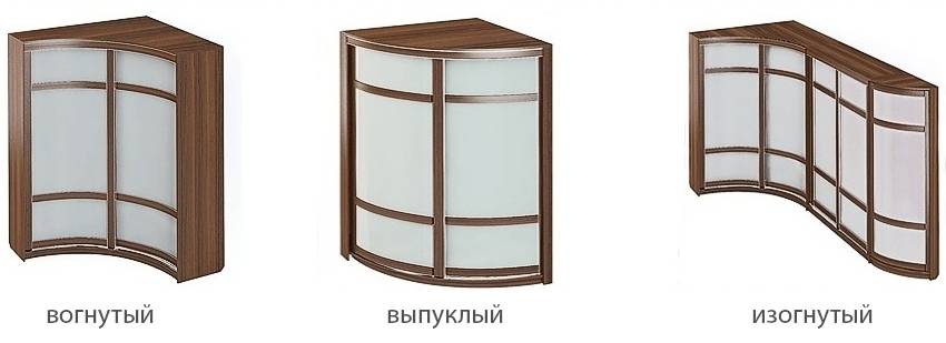 Самыми сложными в исполнении и дорогостоящими являются радиусные шкафы-купе, у которых движение дверей осуществляется по радиусу окружности. Фасад таких конструкций изготавливается из дорогих материалов по особой технологии, что заметно увеличивает цену встроенного в прихожую шкафа-купе. Однако это компенсируется эффектным, стильным, оригинальным и неповторимым внешним видом. Данная модель способна вписаться в любую планировку, что связано с эргономичным открыванием дверей. Недостатком шкафа является невозможность использования зеркал и ЛДСП при изготовлении дверей.