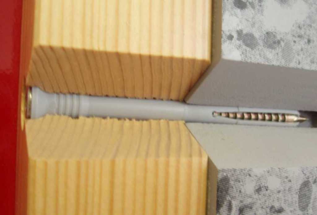 - Когда раствор полностью высохнет, брус приставляют к стене и закрепляют этим шурупом.