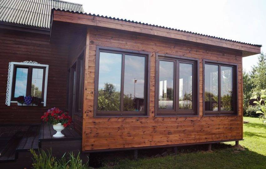 Если вы хотите, чтобы температура воздуха в помещении веранды была бы достаточно комфортной и в случае непогоды, и в холодный сезон, выбирайте для постройки стен плотный материал. Ограждающие конструкции не должны иметь щели и зазоры. Чтобы лучше сохранять тепло в помещении, желательно двойное остекление.