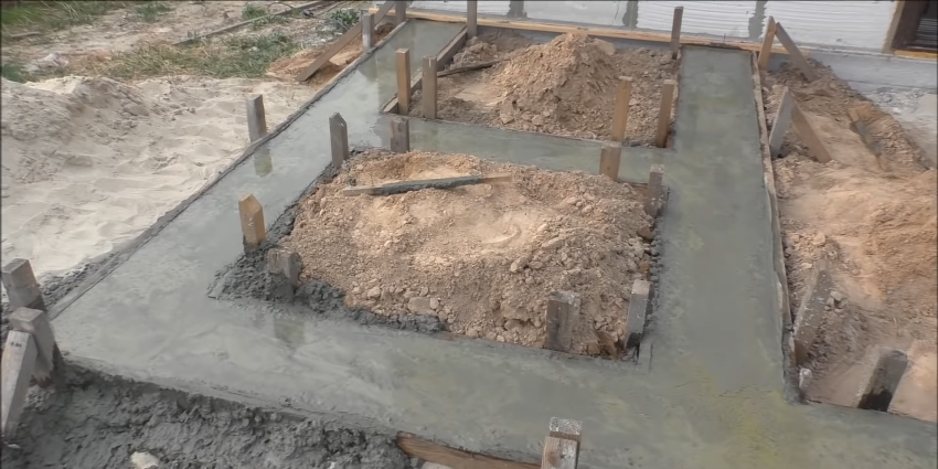 - Залить бетон (1 часть цемент М500, 3 части песка, 5 частей щебня, фракции 5, вода).
